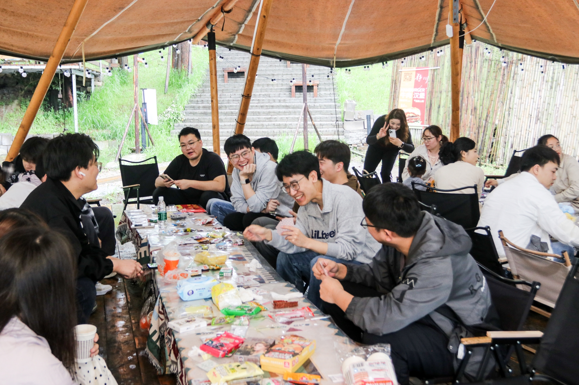 在自助烧烤环节,党员们分工协作有的生火,有的准备食材··· 每个步骤都有条不紊。在彼此默契的配合下,一场简单的 BBQ 演变为一堂生动的 “团队协作课堂”。即便此时天空飘起细雨,帐篷内却依旧欢声笑语不断,大家在大快朵颐的同时,情感交流也愈发深厚。